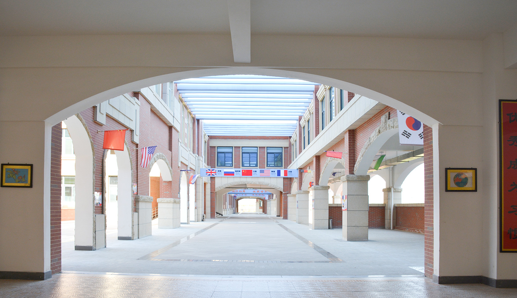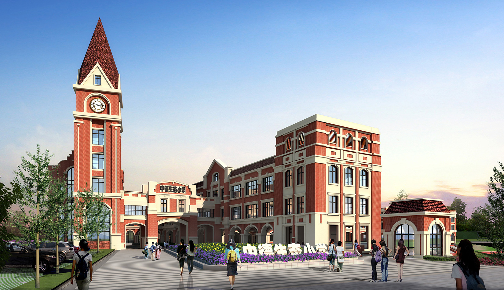 校園建筑風格采用簡約歐式風格,以明亮、歡快的紅磚作為校園主體色調(diào),通過淺色石材、線腳的穿插勾勒建筑輪廓,形成極具特色的歐式花園式校園。