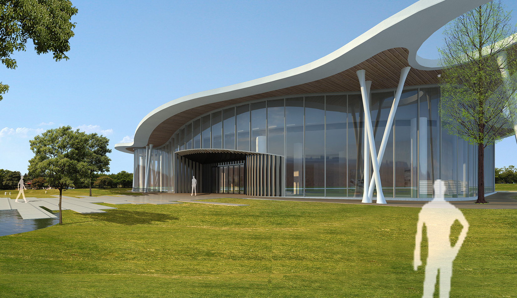 該項目以“森林中的小屋”為理念,通過“自由流水形態(tài)的木質(zhì)屋頂加純凈的玻璃幕墻”的組合,從而達到建筑與自然的共生,使得建筑真正的融合于自然風(fēng)景之中。設(shè)計師將節(jié)能、
