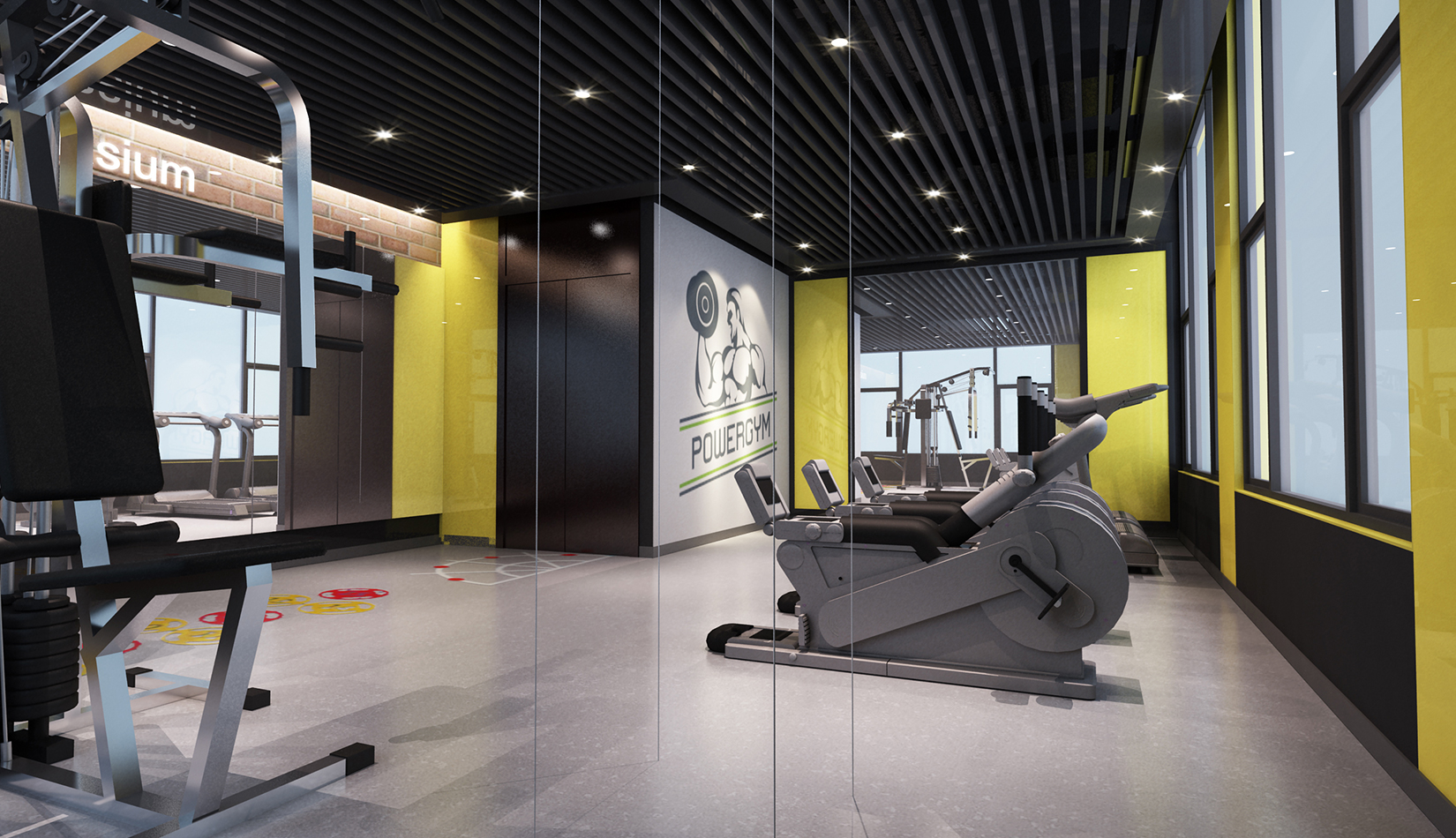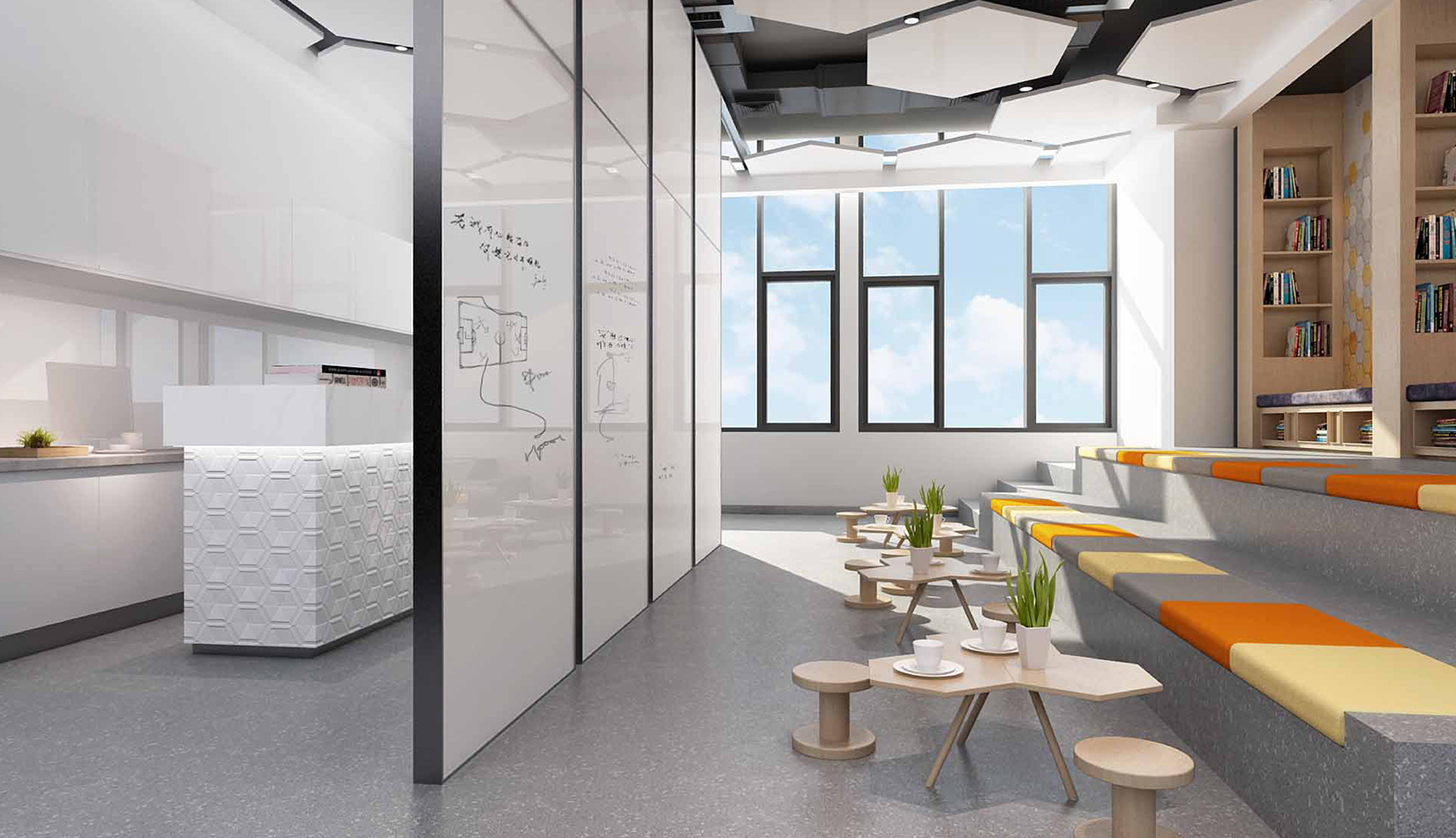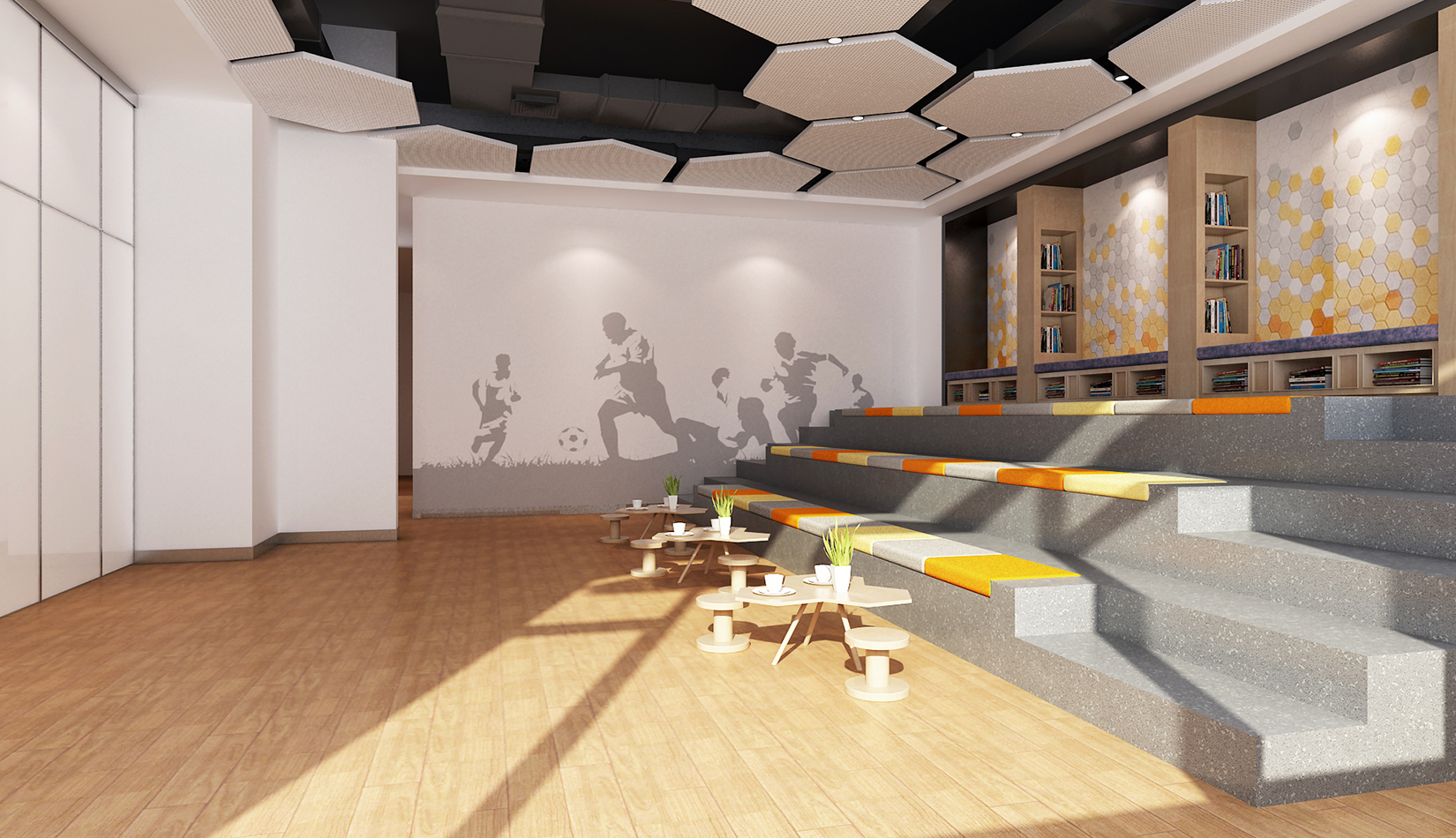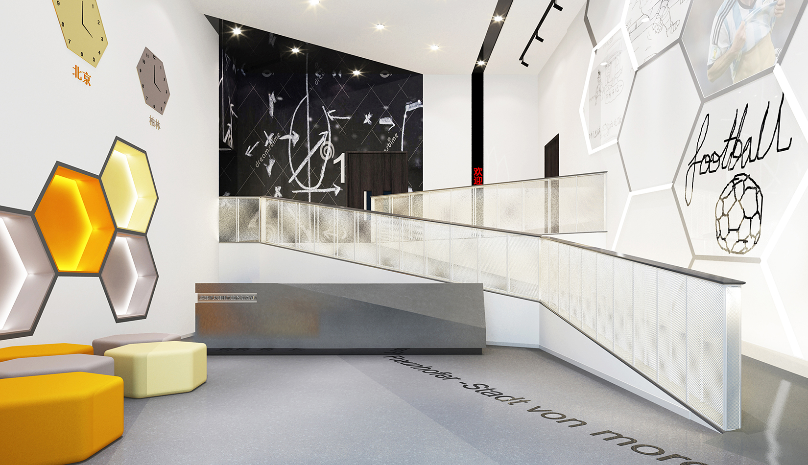 一層大廳提取足球六邊形元素作為墻面背景,在此設(shè)計人行坡道,方便人流同行,并能形成較好的形式感。