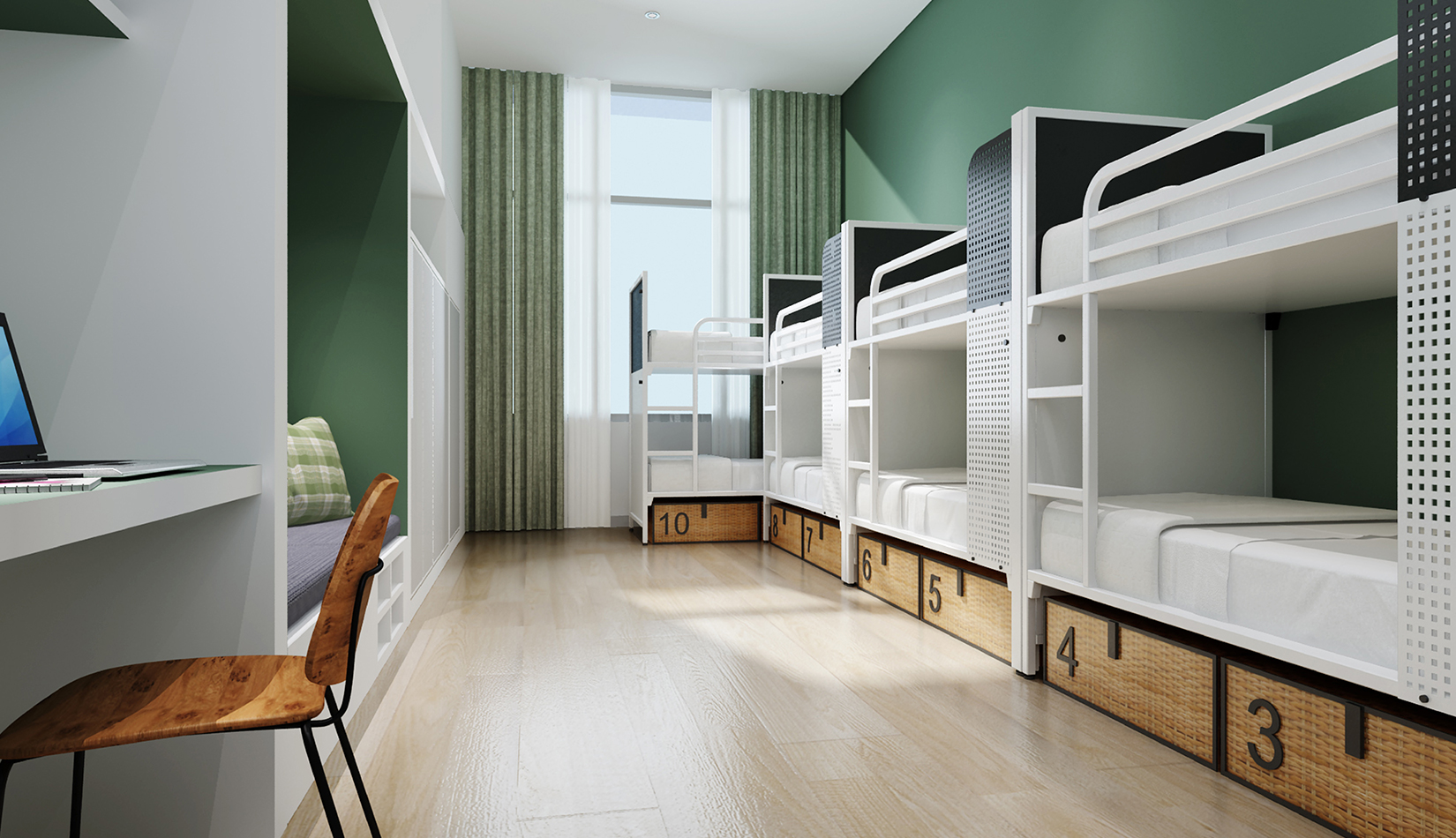 客房采用木色為空間主色調(diào),巧妙利用上下床與衣柜的組合排列方式構(gòu)建出一個簡潔精致的精品化公寓。
