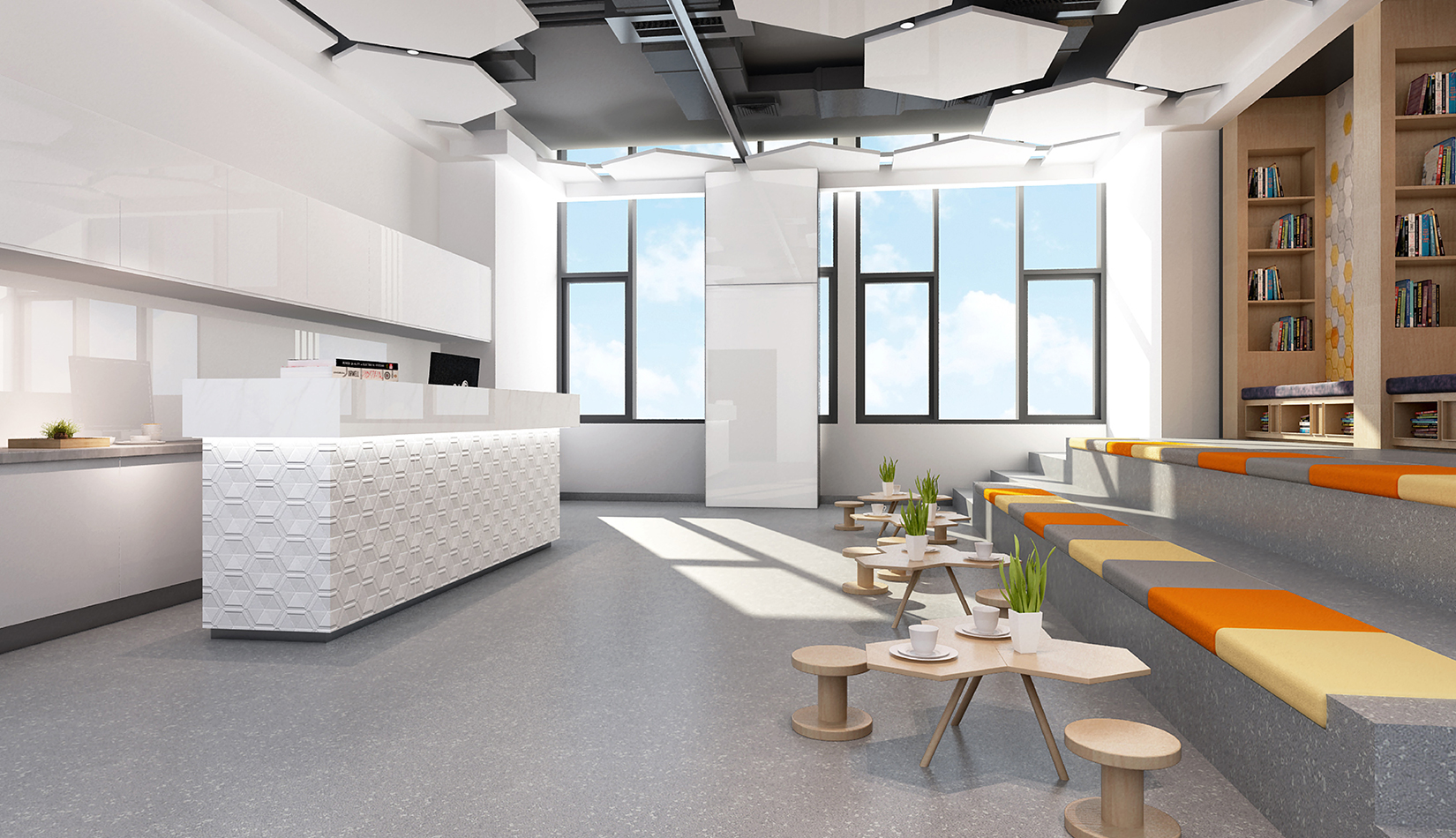 前臺營造一種開放式的交流空間,為入住者提供一個充滿活力的社交空間、資源共享空間、閱讀空間,包括水吧、讓你放松的圖書館,還可承辦各種活動,時尚的設(shè)計以及獨特的個性,便于大家面對面溝通和社交體驗。