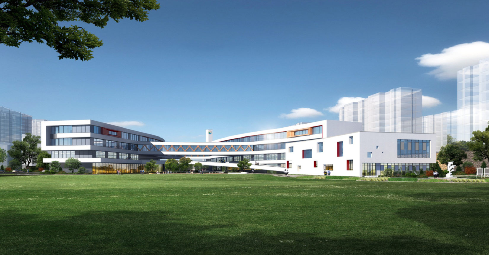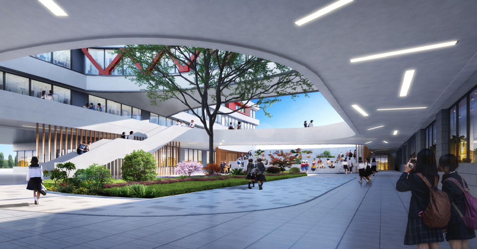 校園規(guī)劃采用曲線手法,營造流水姿態(tài),將東側(cè)山脈與西側(cè)河流連接在一起。設計現(xiàn)代化“山水”校園,使學生在自然中成長。營造活水發(fā)源的“源頭”意境,寓意教育為人類文化長河的源頭,呼應學?!霸搭^”文化。曲線舒展的形體,整體采用白色色調(diào),局部以紅黃色進行點綴,風格純潔又不失活潑。